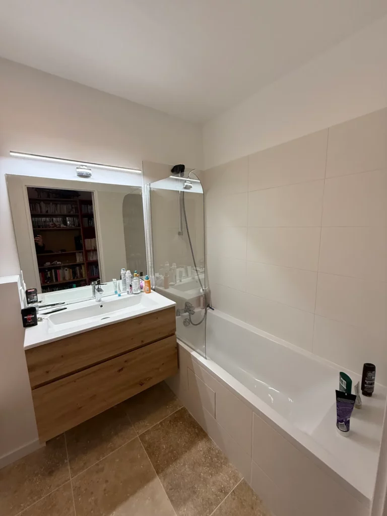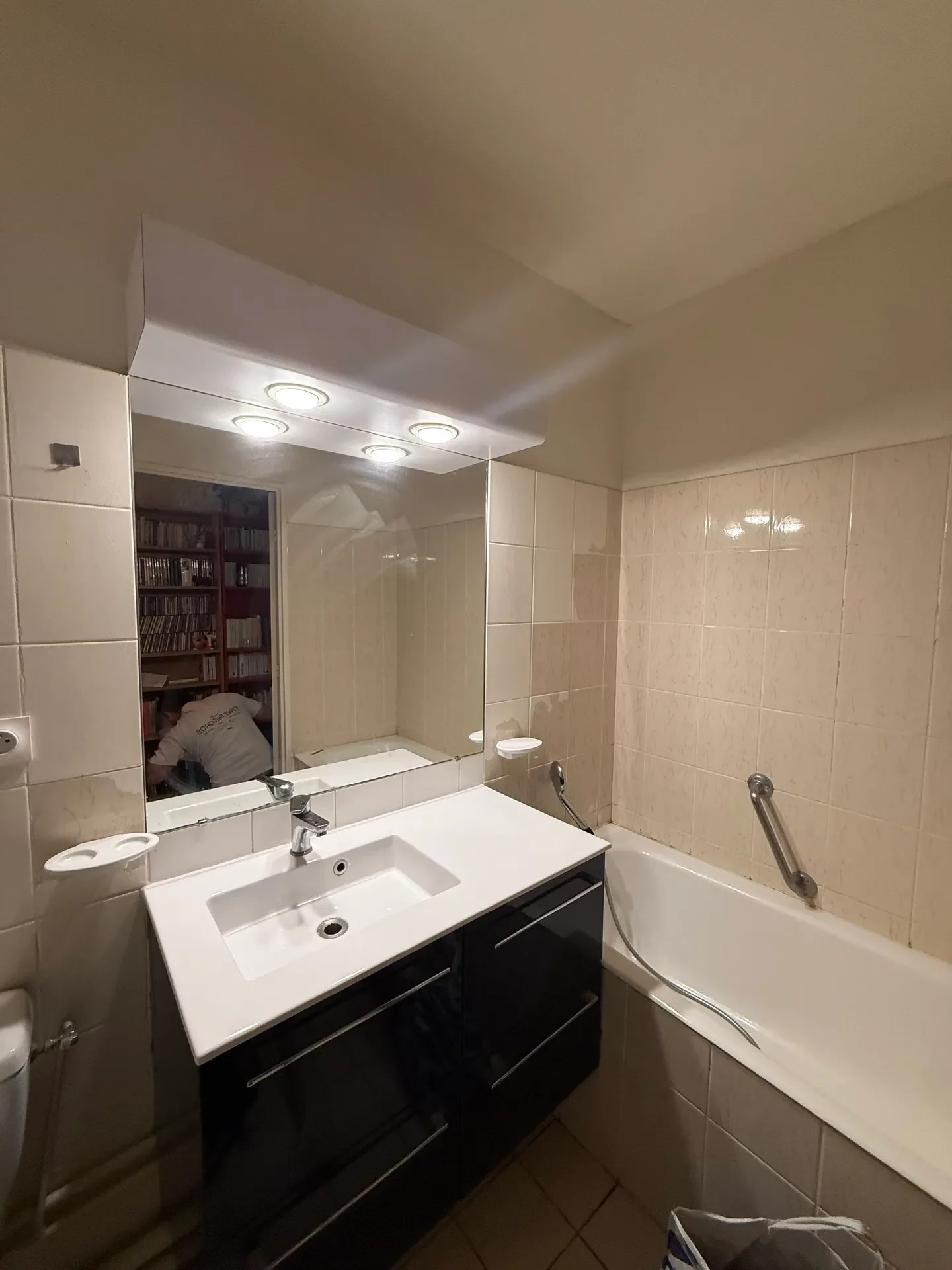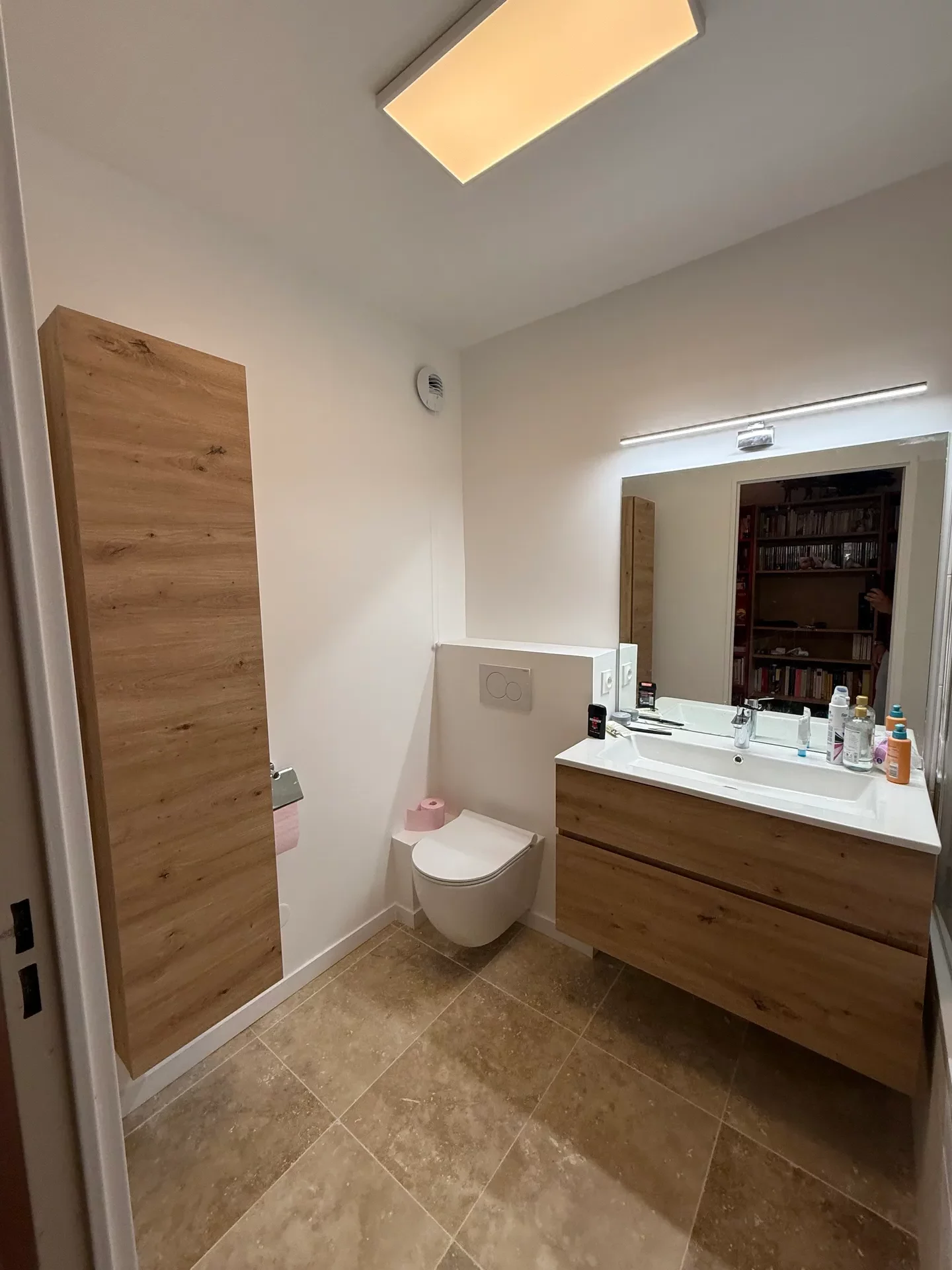 Notre équipe a assuré l'ensemble des corps de métier : pose de carrelage mural et au sol, travaux de plomberie avec installation d'un WC suspendu, mise aux normes électriques, peinture et finitions soignées.